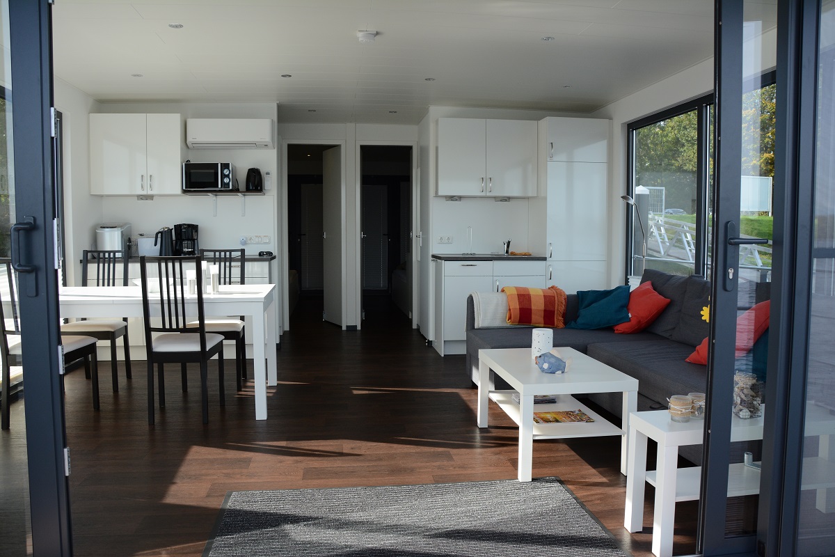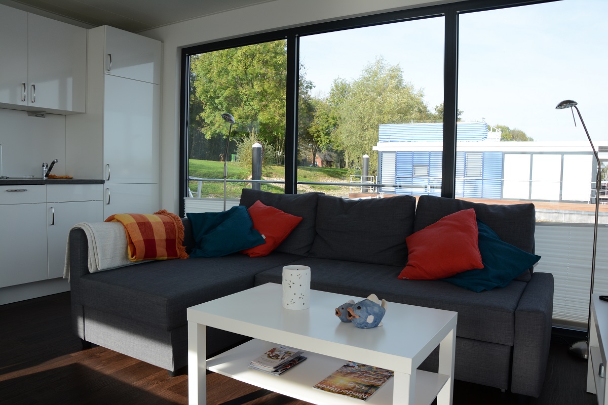 | Ein Wintergarten auf dem Wasser ? Sie verfügen über einen großen rundum verglasten Wohn-Essraum mit gemütlicher Sofaecke, großem Esstisch für 6 Personen, großem Flachbildfernseher, einer Küchenzeile mit Cerankochfeld und reichlich vorhandenen Utensilien. |